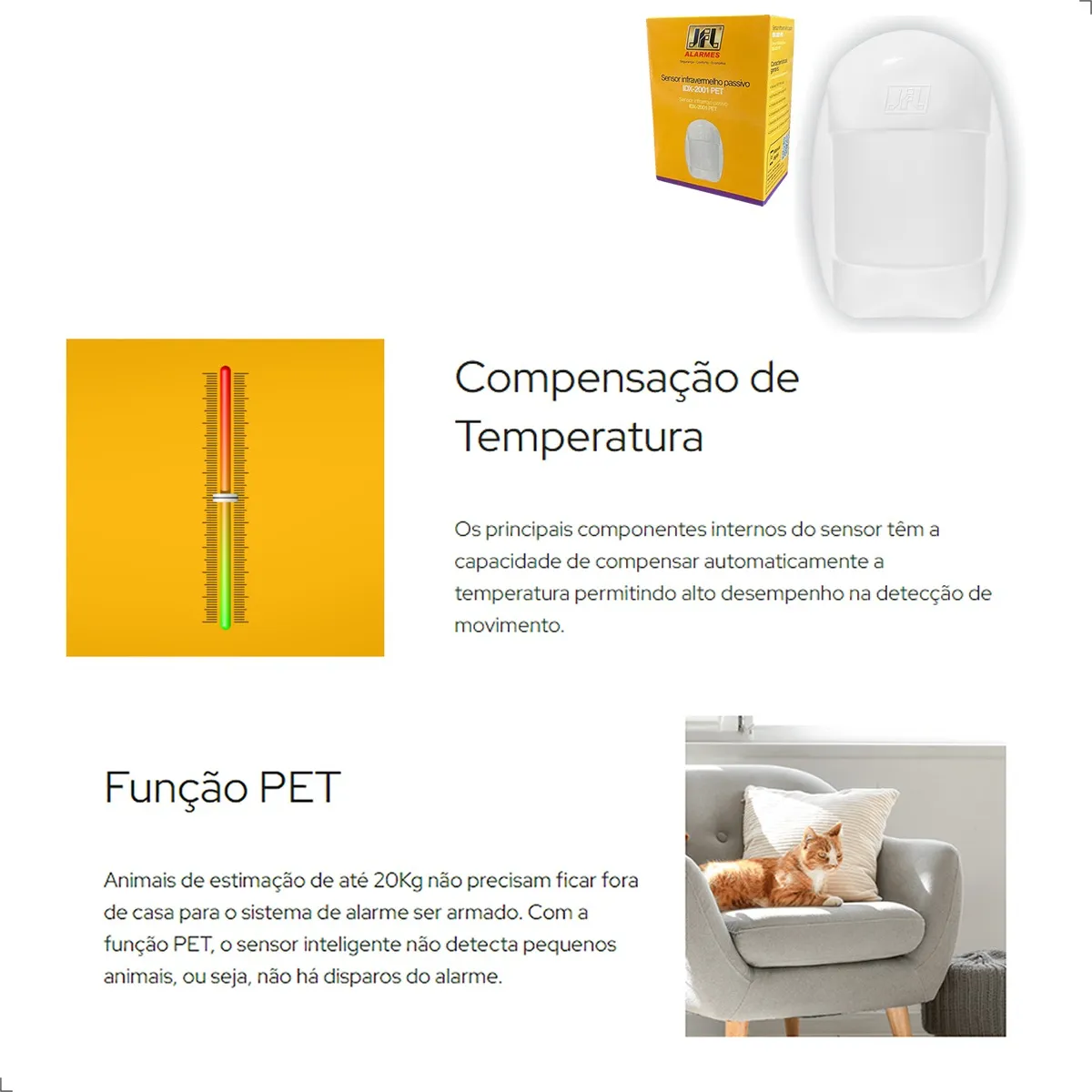 • Função PET:Animais de estimação de até 20Kg não precisam ficar fora de casa para o sistema de alarme ser armado. Com a função PET, o sensor inteligente não detecta pequenos animais, ou seja, não há disparos do alarme.